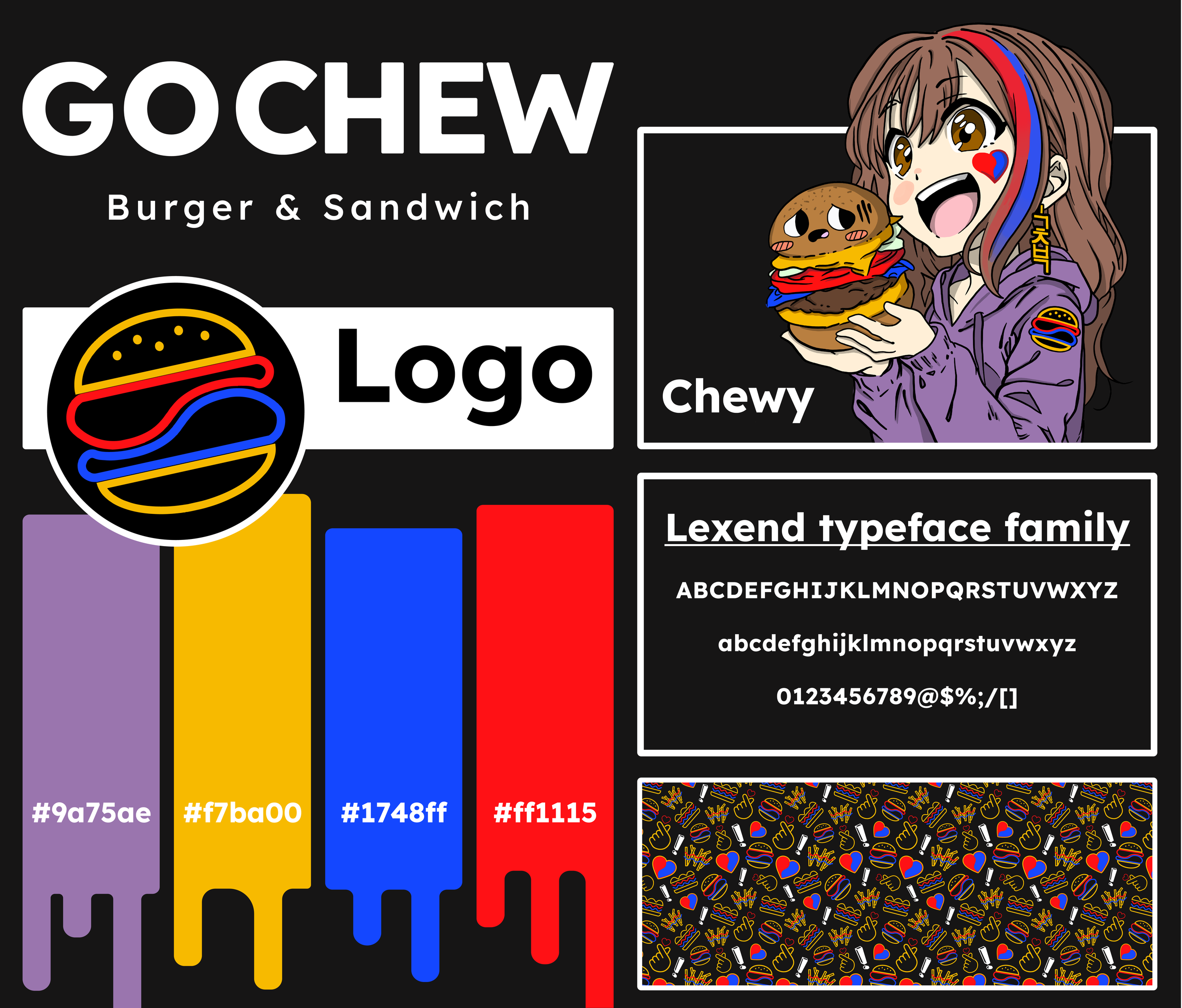 Go Chew is a Korean-owned, Kansas City–based food truck that serves classic American burgers and fries with an Asian twist. I worked with the company to refine and strengthen their brand identity, focusing on creating a look that would stand out and connect with a younger audience. The owner had already established certain fonts and colors, so my role was to refine and organize these elements while expanding on them to build a more cohesive and engaging system.